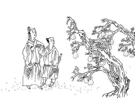 书生忽觉口干舌燥,想吃个梨子,看了看四周,没有一个人影,向谁讨个梨呢。他们走到一棵老梨树下,只见那老梨树干粗可合抱,支干盘曲如苍龙行空,枝叶繁茂,果满枝头。